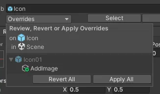 Allのボタンを押すとすべての要素がPrefabに反映されるため、