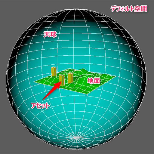 そこに宇宙空間や空などの空間を表現するために、巨大な球状のモデルを配置するのが一般的です。