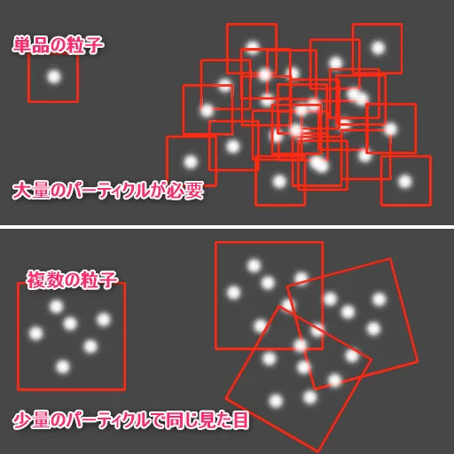エフェクト作成の際によくありがちなこととして「パーティクル数が多いため処理が重くなる」というのがあります。