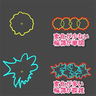 ランダム回転や拡縮で複雑な輪郭になるよう「輪郭に変化がある絵」を意識してみてください。
