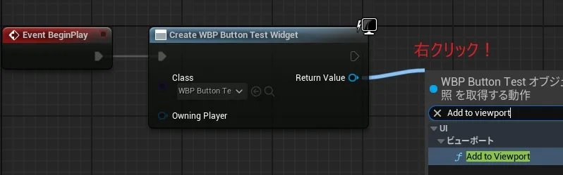▼12.「LV_ButtonTest」のレベルブループリントの「BeginPlay」ノードの近くで右クリックし、「Create Widget」ノードを作成します。