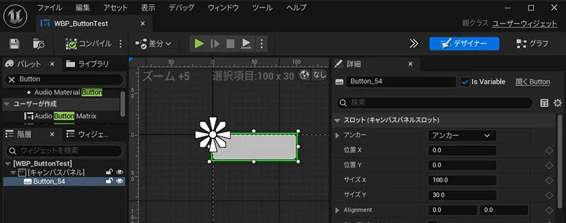 ▼03.「WBP_ButtonTest」を開き、階層ウインドウに「CanvasPanel」と「Button」ウィジェットを画像のように配置してください。