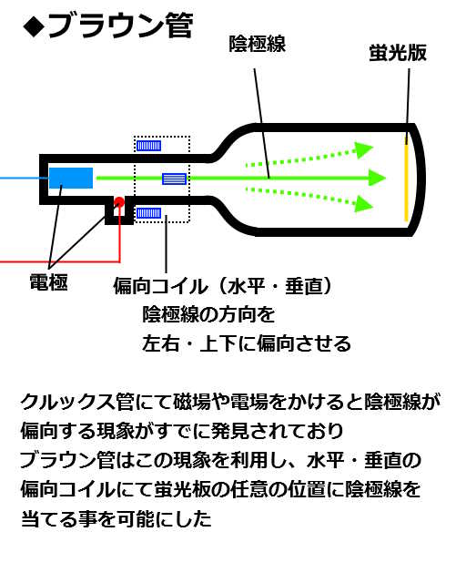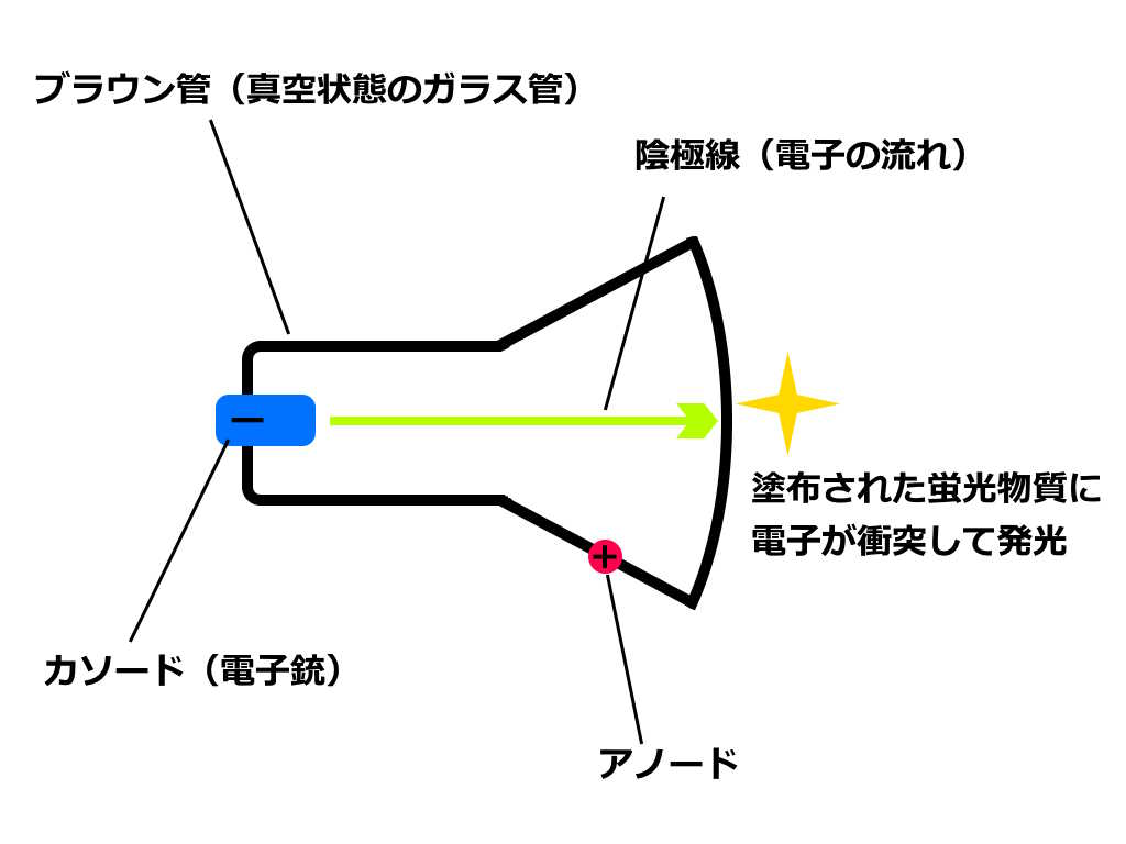 ブラウン管はこの陰極線を利用して画像を表示するデバイスであり、陰極側(電子銃と呼ばれている)から